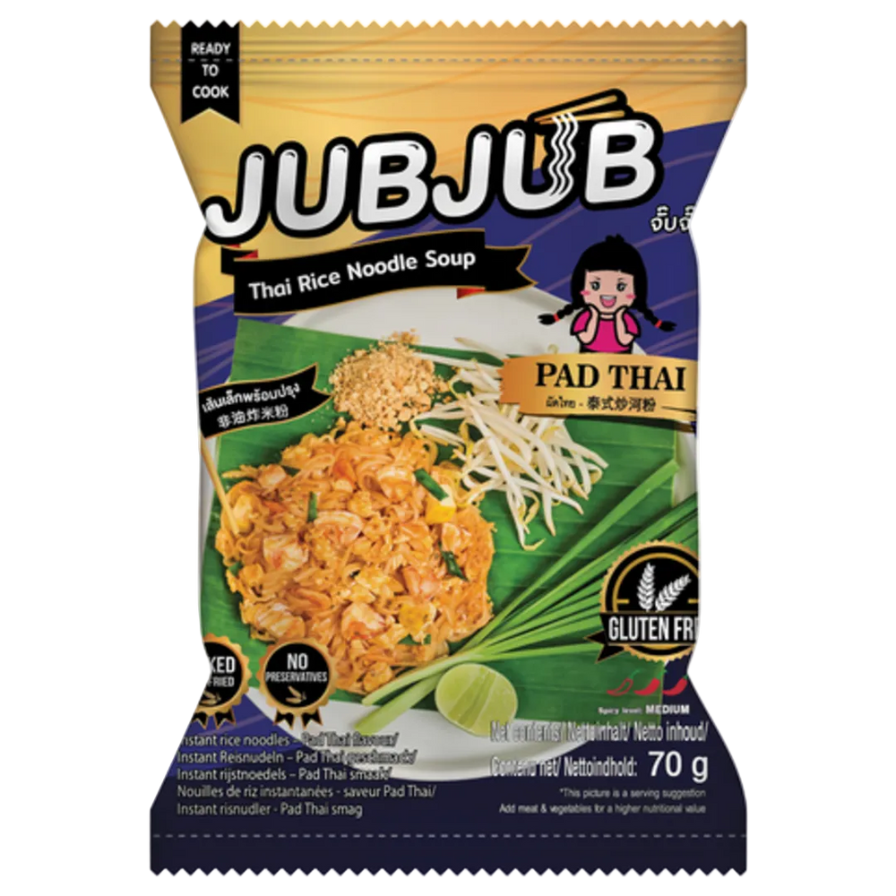 Craving authentic Thai street food? Jub Jub Instant Pad Thai offers a quick, delicious solution in a convenient 70g pack. Featuring a naturally gluten-free rice noodle base and a rich sauce made with real tamarind, fish sauce, and a hint of chili, it strikes the perfect balance of sweet, sour, and savory. The brand name "Jub Jub" reflects a playful, quick snack culture—perfect for busy professionals or students looking for a high-quality meal in minutes. Just add hot water, drain, and mix for a professional-grade Pad Thai experience.