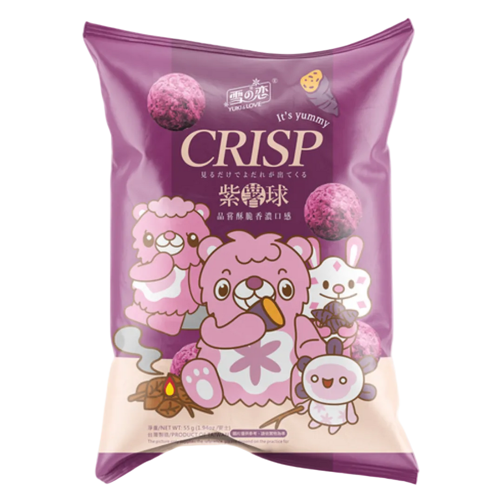 Taiwan’s eye-catching corn crackers infused with real purple yam (ube) for a vibrant violet colour, light airy crunch and subtle naturally sweet-nutty flavour that’s mildly addictive without being overpowering. Made from premium corn and authentic purple yam, these crispy snacks deliver a delicate sweet undertone with perfect crispiness, making them a fun, healthier alternative to regular chips loved across Asia for their unique look and taste. Ideal for tea-time nibbling, on-the-go munching, party sharing or pairing with dips – a standout Taiwanese treat that adds colourful variety to your snack rotation. Grab this convenient 55 g pack and experience Yuki & Love’s delightful purple yam crunch today.