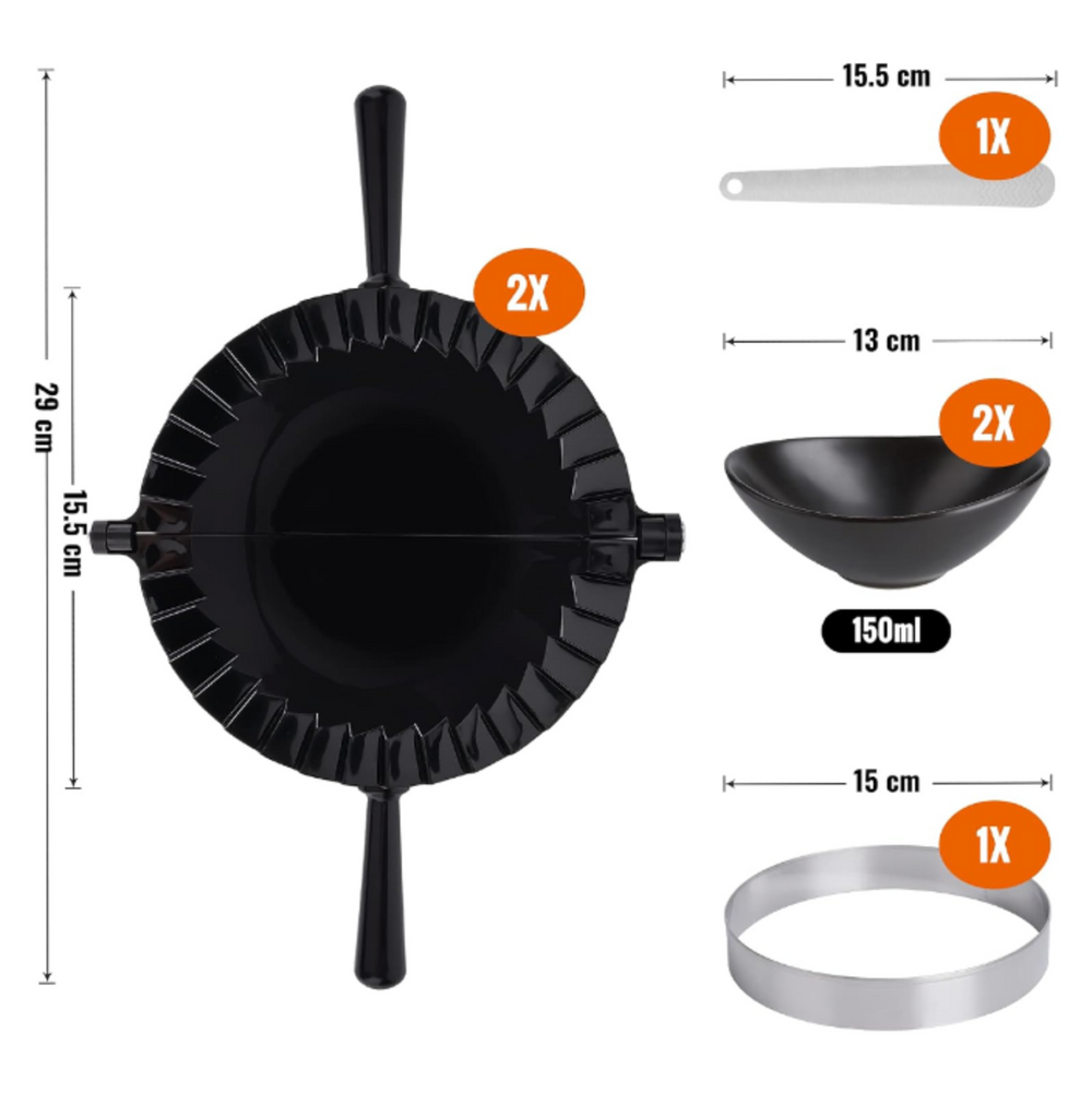 Jei jus domina matmenys: Dviejų juodų plastikinių empanadų keptuvių skersmuo yra 15,5 cm, o keraminių dubenėlių talpa - 120 ml, todėl jie puikiai tinka kaip dubenėliai. Nerūdijančio plieno keksiukų pjaustyklės skersmuo yra 15 cm. Pridedamo peilio ilgis - 16 cm. Jį taip pat galite naudoti ravioliams arba, pavyzdžiui, calzone picai gaminti.
