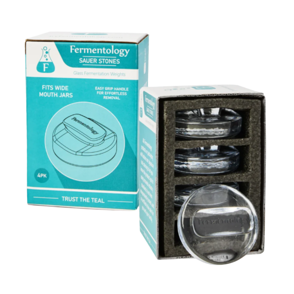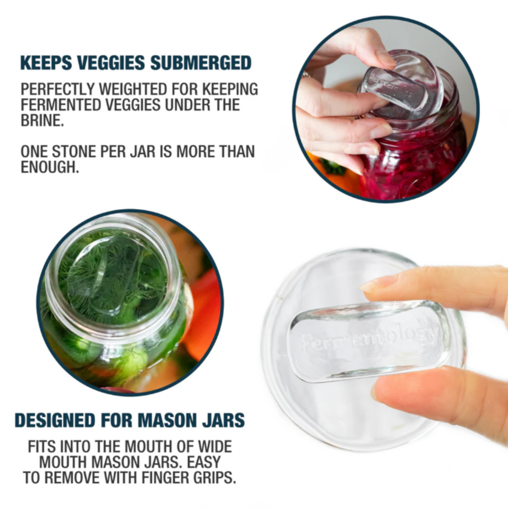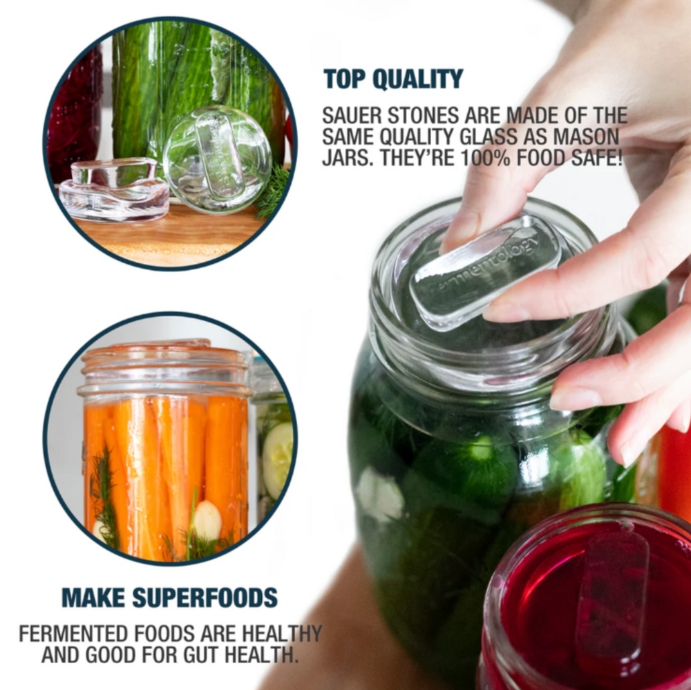 Stiklo fermentacijos svarmenys siauriems (70 mm) stiklainiams FERMENTOLOGY yra specialiai sukurti taip, kad tilptų į siaurų stiklainių angas. Rauginkite kopūstus, marinuotus agurkus, kimči ir kitus produktus Masonų ir konservų stiklainiuose ar net skardinėse. Su „Sauer Stones“ lengva gaminti naminius lakto fermentuotus maisto produktus: jie suslegia daržoves, pavyzdžiui, kopūstus, agurkus, morkas ir kt., žemiau sūrymo, kad jos nesugestų. Tiesiog įdėkite juos į stiklainį su paruoštu raugu, lengvai prispauskite ir pradėkite rauginti. Šie stikliniai svarmenys puikiai tinka nedideliems daržovių konservams stiklainiuose ir tinka bet kokiam tūriui - nuo mažo uogienės stiklainio iki galono stiklainio ir kt.