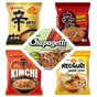 Five premium Nongshim instant noodles featuring diverse flavors: real kimchi, black bean sauce, seafood mild, spicy chicken, and gourmet stir-fry.